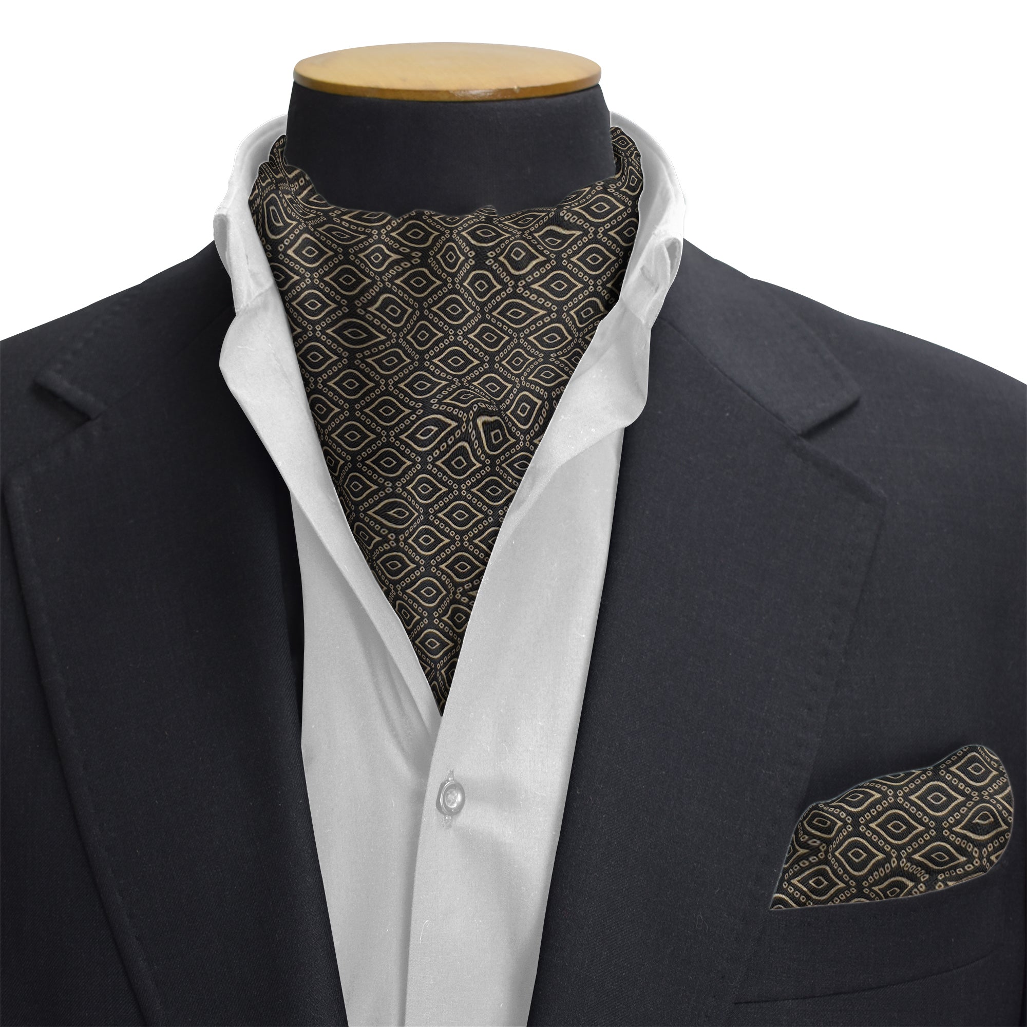 BLACK & GOLD DIAMOND PATTERN CRAVAT & POCKET SQUARE SET