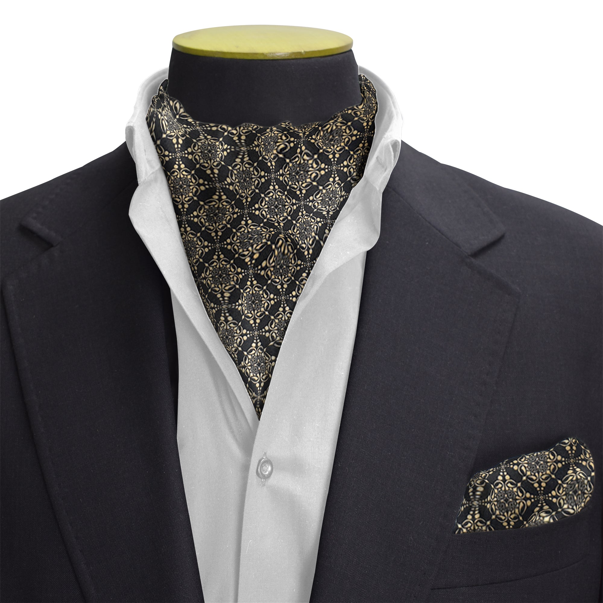 CLASSIC FLORAL GOLD & BLACK CRAVAT & POCKET SQUARE SET