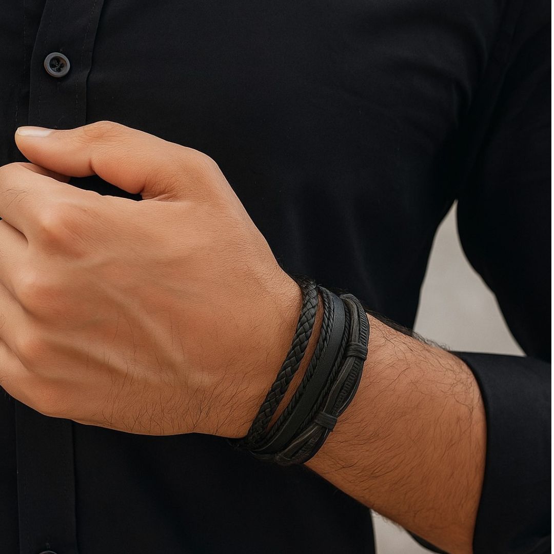 Crafted for black lovers, this set blends braided leather, smooth bands, and matte beads for a bold, all-black statement. Perfect for adding effortless edge to any look.