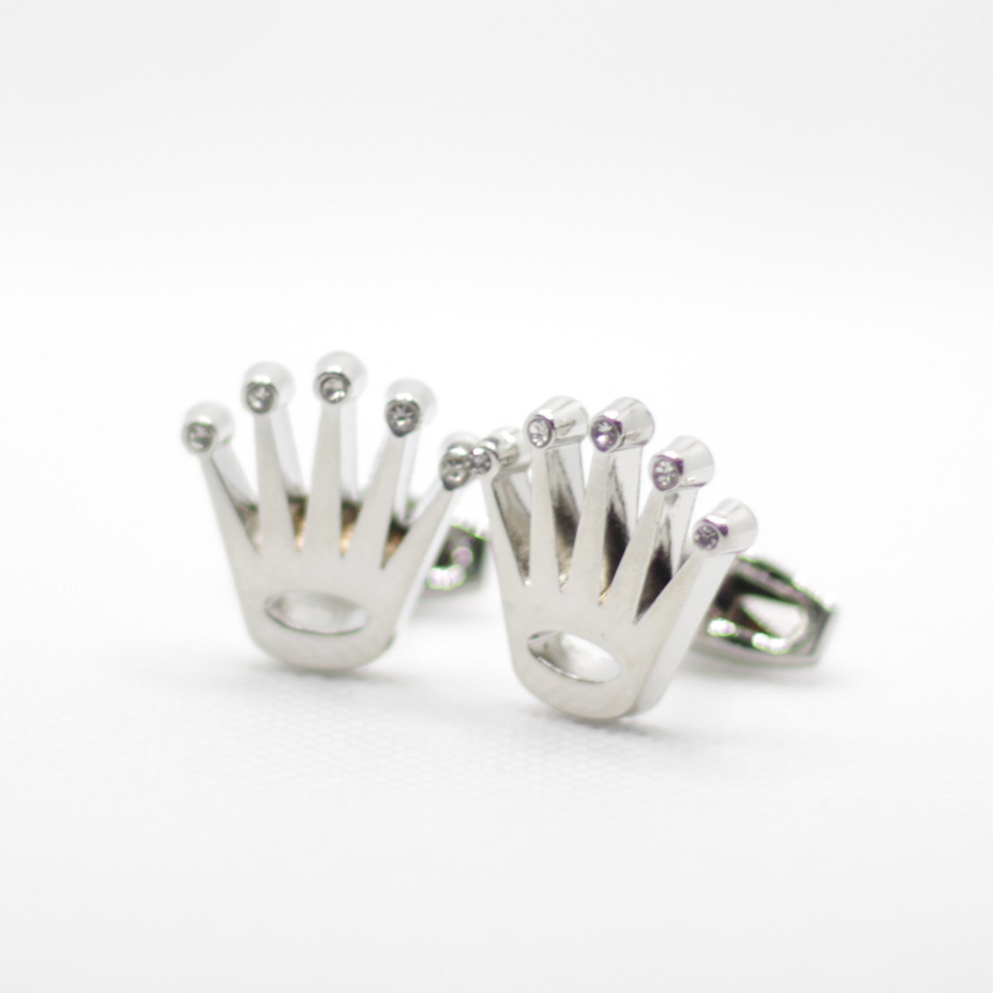 Pair of silver crown cufflinks with sparkling diamonds embedded.