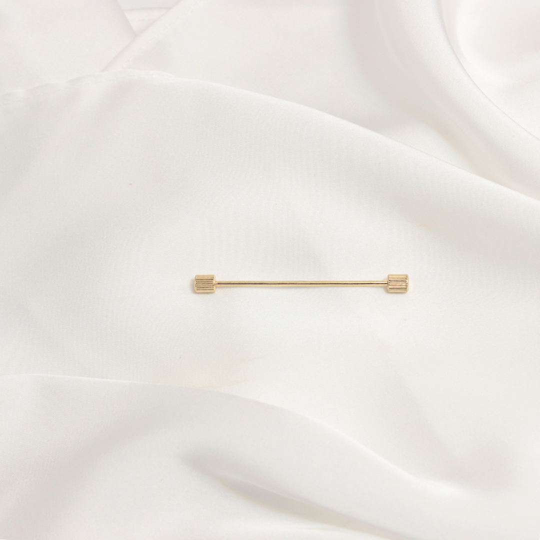 A sleek metallic collar pin with ribbed cylindrical ends, crafted to add structure and style to your formal look.