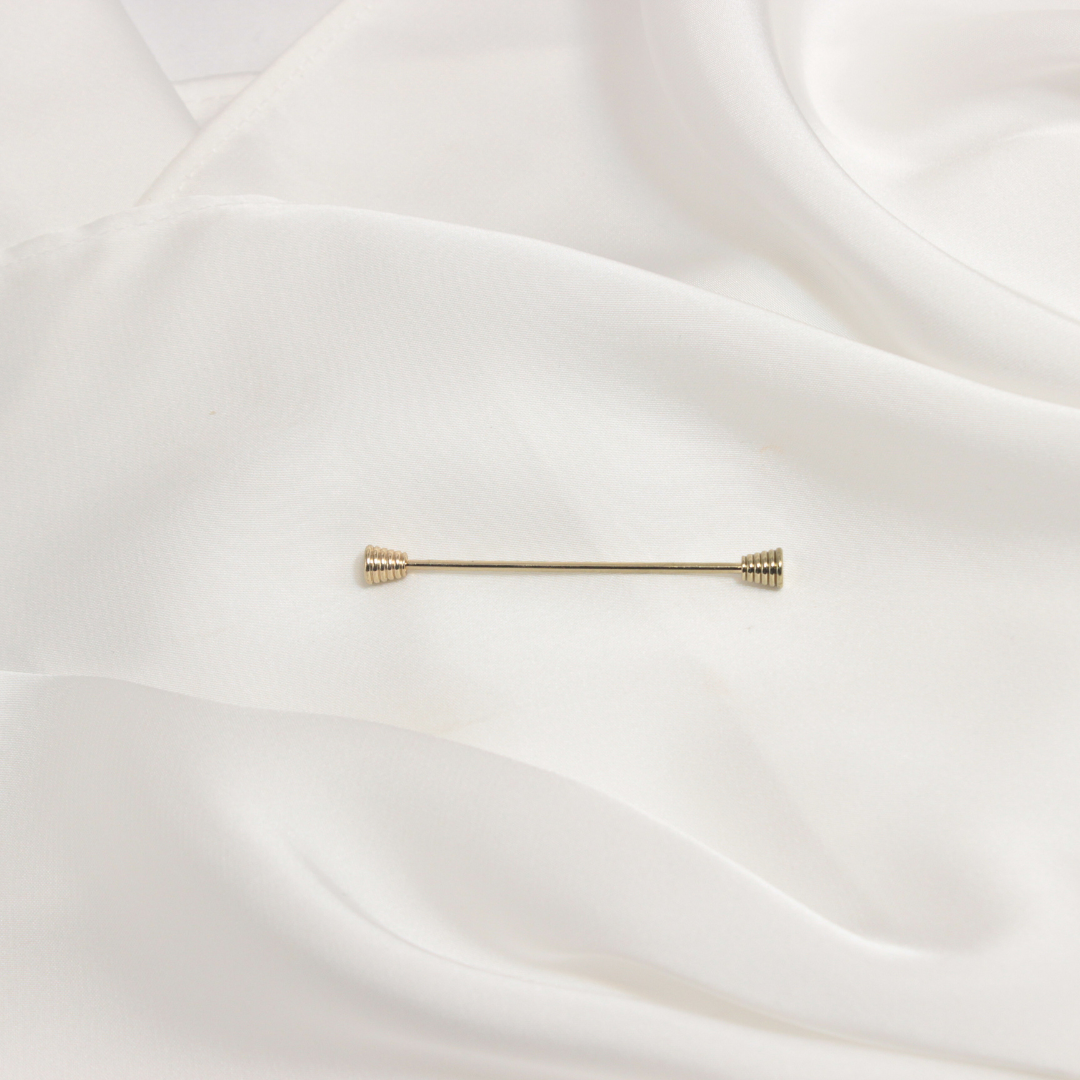 Designed with uniquely stacked spiral cone ends, this collar pin adds a bold, sculptural accent to any refined ensemble.