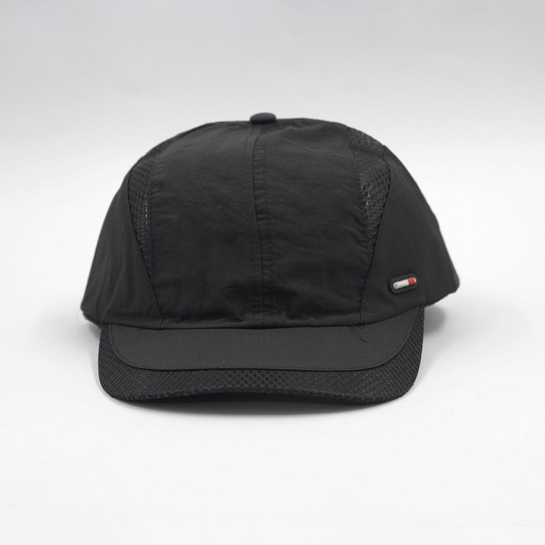 "Jet Black Sports Cap," features mesh panels for enhanced breathability and a comfortable, relaxed fit. Complete with a sports tag for added flair, it exudes a stylishly sporty aesthetic.