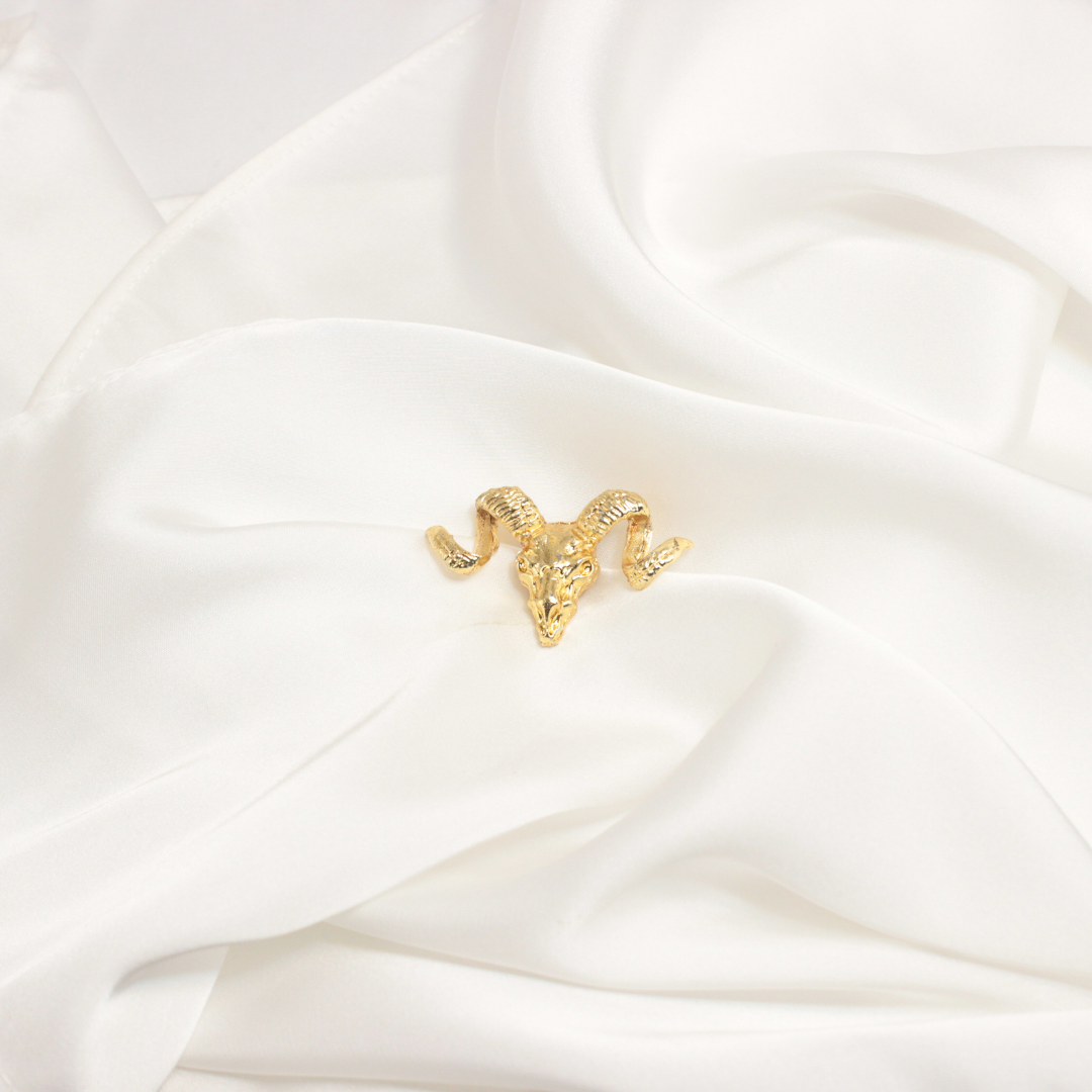 Sculpted in metal with gold and silver finishes, this brooch blends power with heritage.