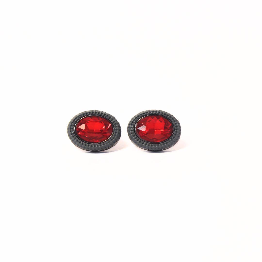 The Radiant Rouge Oval Red & Grey Cufflinks showcase a striking red stone encircled by a sleek grey border on a metallic grey base. Elegant and sophisticated, they add a refined touch to any formal or business look.