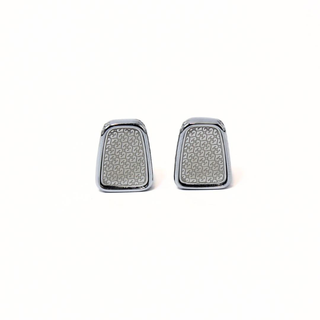 A distinctive design featuring a unique rectangular shape with a curved end, a polished silver base, and an elegant silver border, accentuated by a refined central pattern for a touch of sophistication and modern charm.