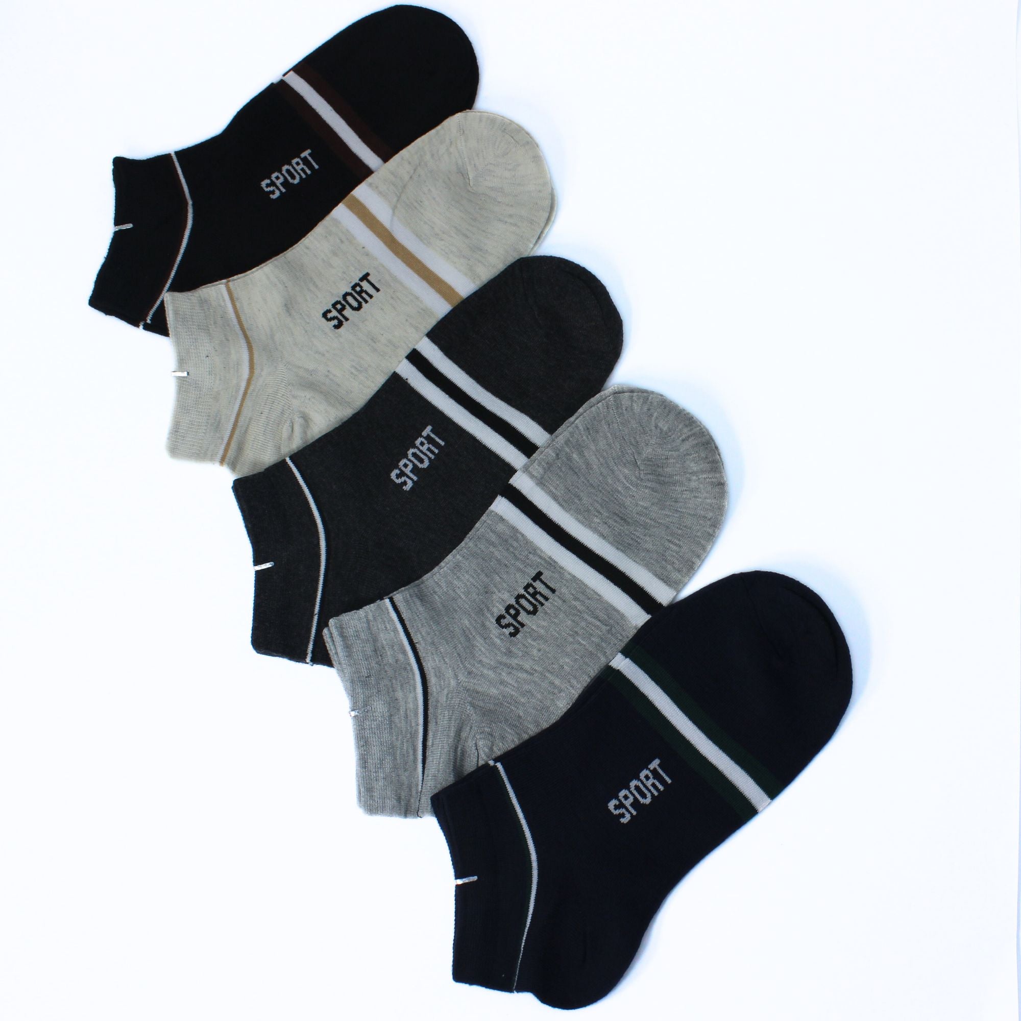 SPORT STRIPE ANKLE SOCKS SET: Featuring a triple stripe pattern with 'SPORT' boldly written on each pair.
