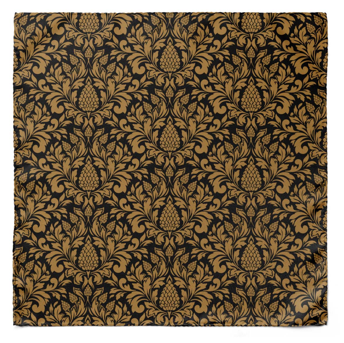 The Gold Vintage Silk Pocket Square blends a deep black backdrop with a sophisticated dull gold vintage pattern, creating an elegant and versatile accessory.