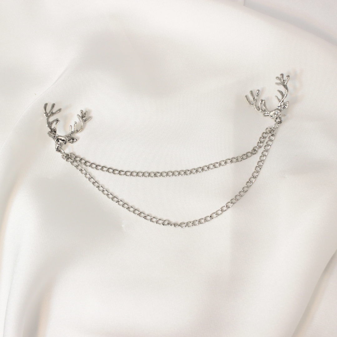 Add a touch of wilderness-inspired elegance with this unique silver collar pin featuring twin deer heads linked by delicate chains. Designed for those who dare to stand out — bold, refined, and undeniably original.