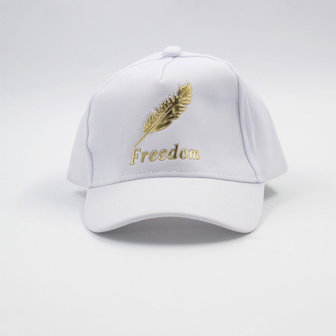 "White Fiery Freedom Cap" juxtaposes the fiery spirit of "Freedom" with the purity of white. Embellished with a feather logo and "Freedom" in gold script, it represents a bold and empowering accessory.